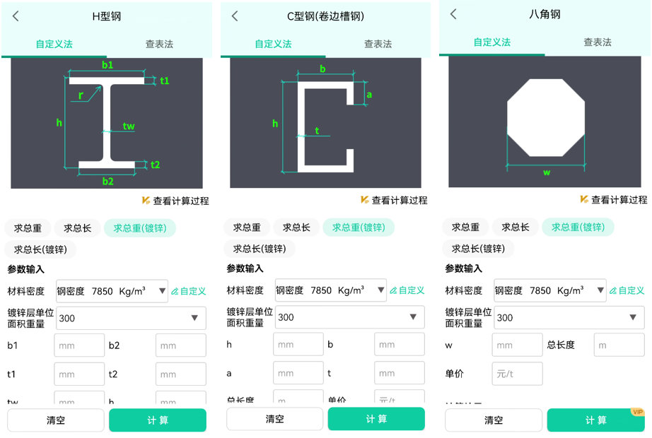 - 增加镀锌tab计算:针对H型钢、C型钢、Z型钢、T型钢、圆钢、等边角钢、不等边角钢、等边卷边角钢、八角钢、六角钢、方钢、扁钢、常用钢板等公式,增加了在镀锌情况下的重量和长度计算,同时镀锌层单位面积重量数据可自由定义,总有满足您实际场景的计算公式。