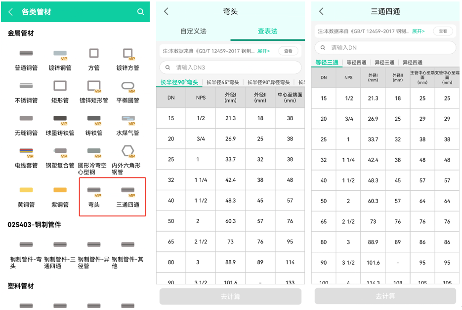 - 三通四通数据:新增各类不同规格的三通四通尺寸数据以及计算规则。
