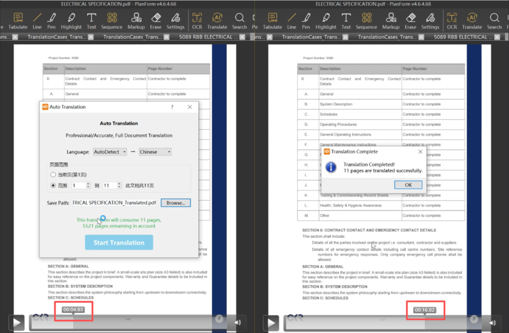 在时间压力下,团队的一位新入职的工程师建议尝试一下他在AI上搜到的一款推荐的PlanForm-AI翻译软件。抱着验证的心态,他们首先上传了11页文件进行测试。测试结果显示,其翻译准确度和版面保持效果基本满足使用要求,仅需人工做少量校核微调就可以投入使用。基于此,团队决定将全部986页文件进行批量上传处理。