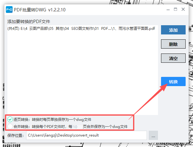可以选择:逐页转换,转换时每页单独保存为一个dwg文件;合并转换,转换每个PDF文件时,按每多少页合并保存为一个dwg文件等方式。