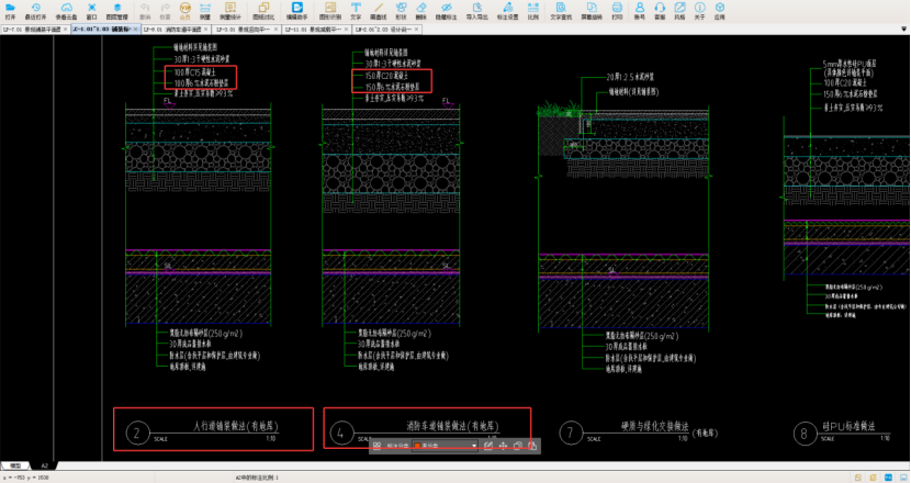 2、铺装标准图中,会显示铺装做法,一般分为有地库和无地库铺装面的做法,本工程为小区园林景观,有地库。小编为方便大家清晰看到做法,只截取有地库做法给大家,有地库做法又分人行道铺装做法和消防车道做法,通过看图,可以了解到以下信息: