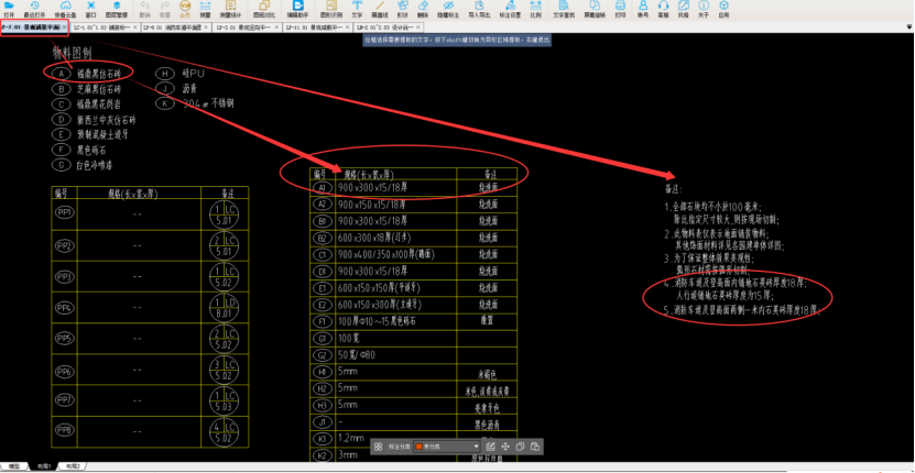 首先看设计说明,关于铺装面的相关信息,如:安装标高,基层种类,消防登高面消防车道石材厚度,做法等等。