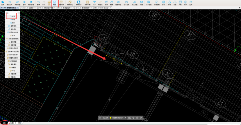 2、算量要选择图纸框线完整的布局中测量,首先要调整图纸比例,保证布局中的比例和模型中一致。同一位置,用测量对齐功能,量出模型中1840mm,布局中7.36mm,数据不一致,要调整。