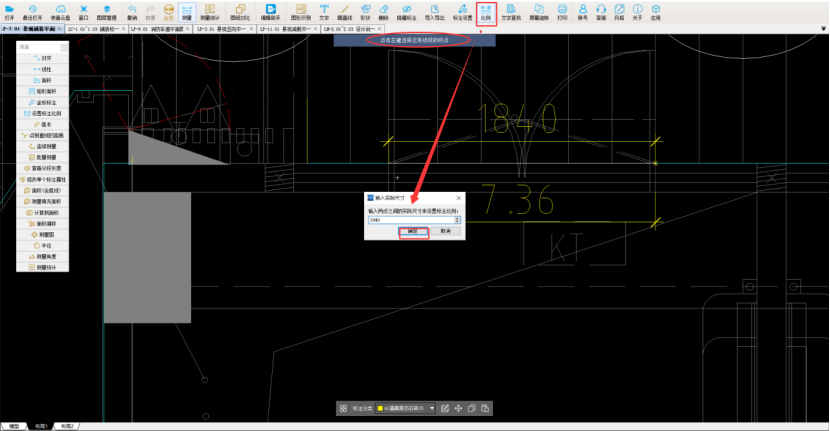 2、点击比例,选取布局中同位置线段,输入1840mm比例就调好了,再用测量对齐功能量取数值为1840mm