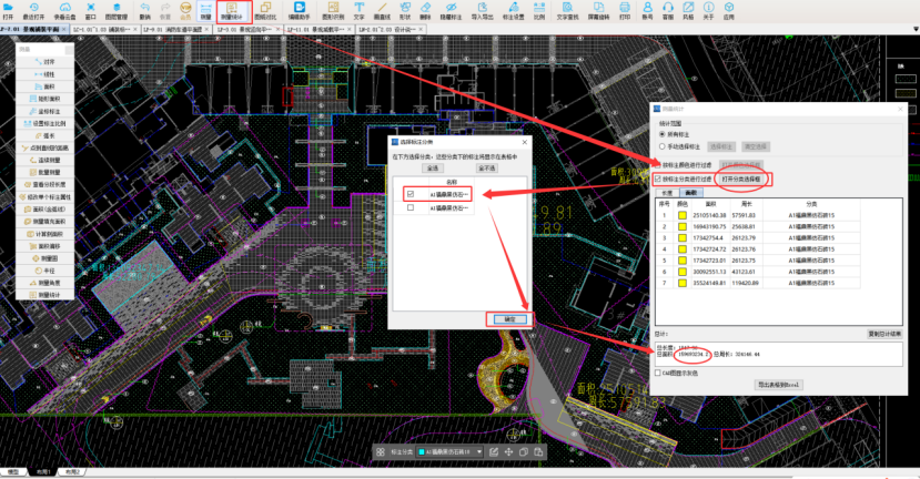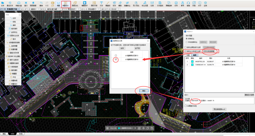 3、测量汇总,选择测量统计,勾选按标注分类进行过滤,勾选A1福鼎黑仿石砖18,确认,我们得出A1福鼎黑仿石砖18mm面积为:180.47㎡,A1福鼎黑仿石砖15mm面积为:159.69㎡。