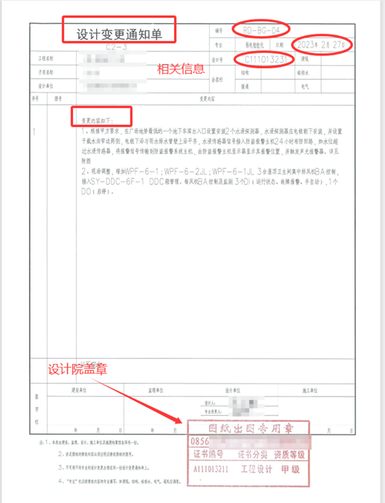a. 留存完整的变更文件,包括机电各专业变更通知单、签证单、修改后的CAD图纸、专业会议纪要、设备厂家报价单等,标注变更日期、变更内容、签字确认情况,避免资料缺失。