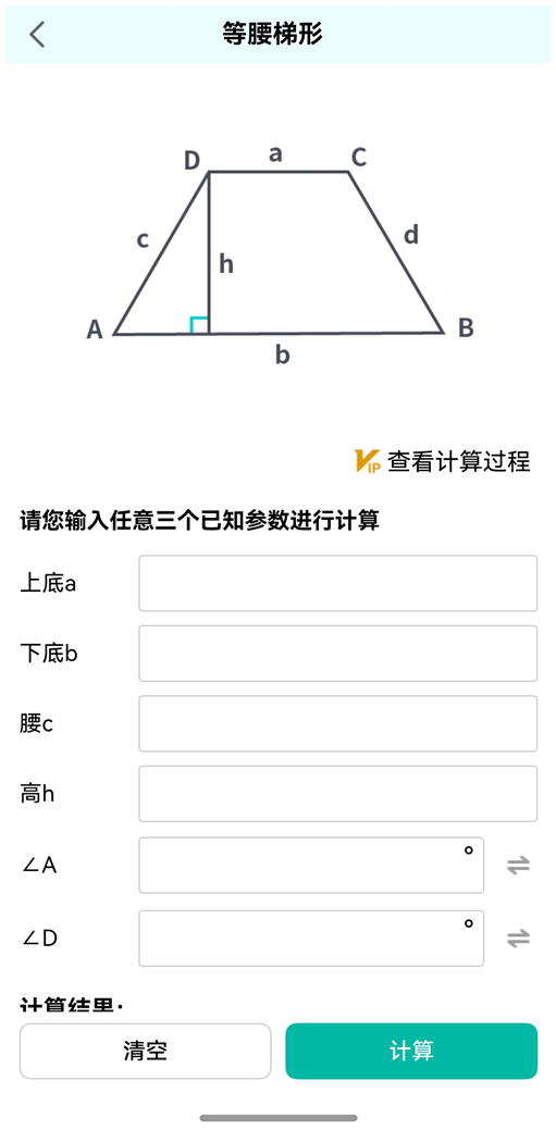 - 等腰梯形:针对等腰梯形计算过程中的不同场景,可以任意输入已知的数据,均能够进行数值的计算。