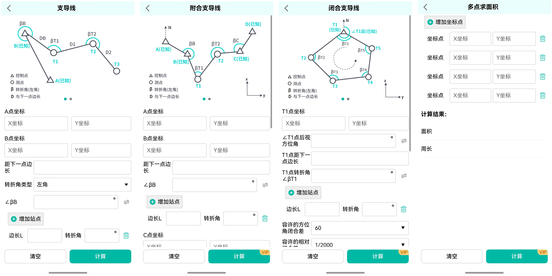 - 支导线、附合支导线、闭合支导线:通过增加站点数据,可以计算各类型支导线的角度数据以及坐标位置。