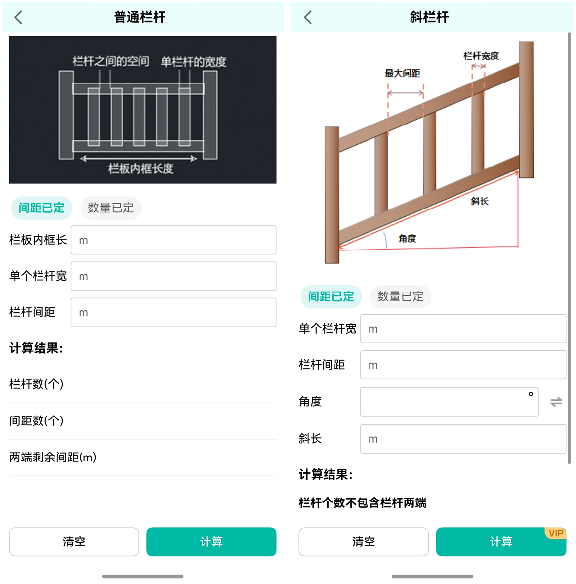 - 普通栏杆、斜栏杆:针对不同类型的栏杆,计算栏杆数量以及间距数据。