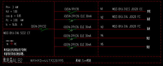 ,配电箱ALB2:W×H×D=447×220×95,离地1.5m明装。