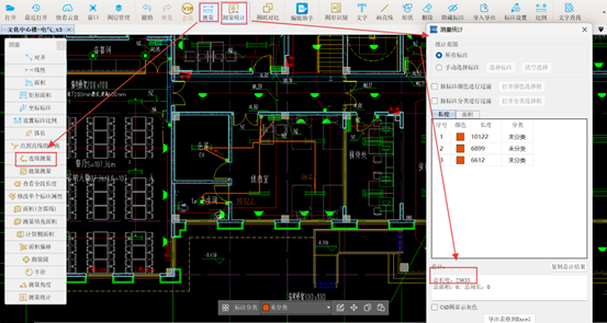 2.在CAD快速看图软件中计算照明回路水平配管:首先,依次选择【测量】和【连续测量】功能,依据设计图示绘制照明回路配管路径;随后,点击【测量统计】,统计显示值班室照明回路水平配管的长度为23.633米。