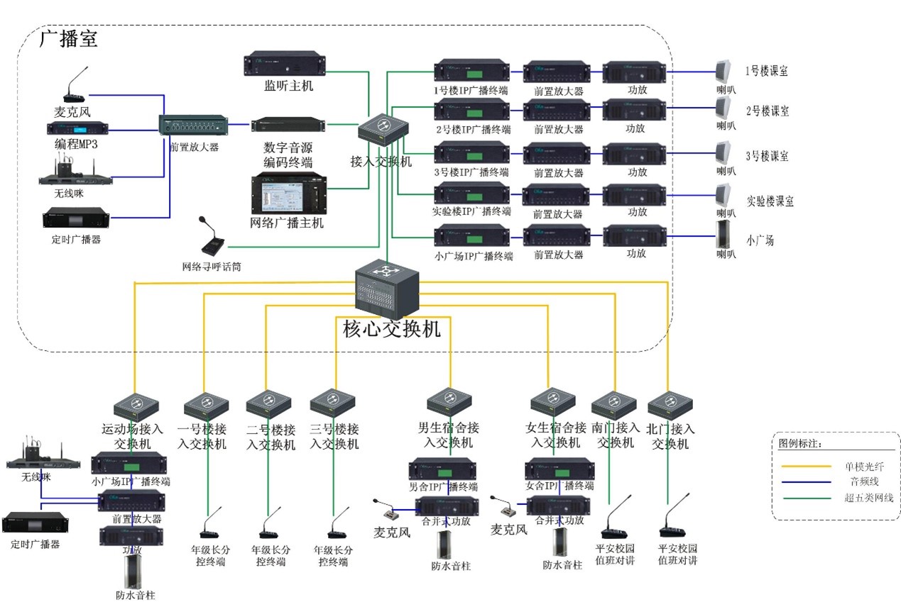广播系统如何施工布线广播系统施工时,布线是很重要的一个步骤,一般广播系统的施工布线在广播系统设计方案中有,具体的布线方案是: