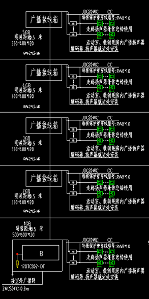 1.观察二层弱电平面图和广播系统图,本案例以二层广播系统为例计算配线工程量。其中2GB广播接线盒明装距地0.5米,规格为300*400*120,扬声器(走廊内,扬声器兼作息铃使用)和扬声器(教室内,广播扬声器)都距地2.4m安装,配线为2根RVV-1.5。