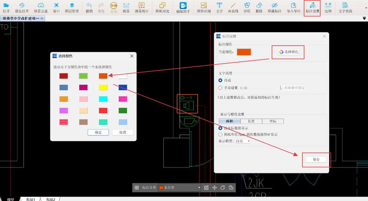 2.为区分两种扬声器配线,使用CAD快速看图中的【标注设置】功能,将扬声器(教室内、广播扬声器)的配线标注颜色改为橙色,将扬声器(走廊内,扬声器兼作息铃使用) 的配线标注颜色改为绿色。