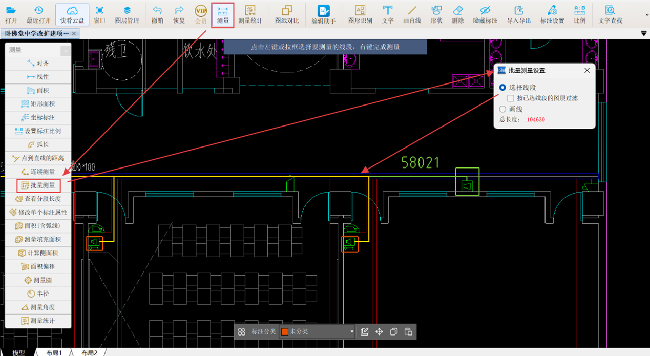 3.依次点击CAD快速看图中【测量】【批量测量】功能,该功能可以选取线段也可以自主画线如桥架和线槽内的配线。如图所示,扬声器(教室内,广播扬声器)的配线水平长度为104.63m。