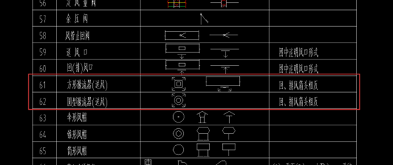 图中空调送风散流器的标注为颈口接管尺寸,百叶风口标注都为面尺寸。风口材质除装修特殊要求外,所有风口都采用铝合金风口,颜色按装修要求定。