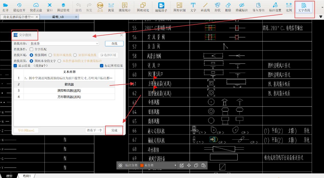 2. 在计算前,为明确散流器的材质及规格等细节,需查阅设计说明。首先,借助CAD快速看图软件的【文字查找】功能,输入关键词“散流器”并设定搜索范围,精准定位相关说明内容。随后,使用【提取文字】工具,将关键信息直接复制到计算表格中。