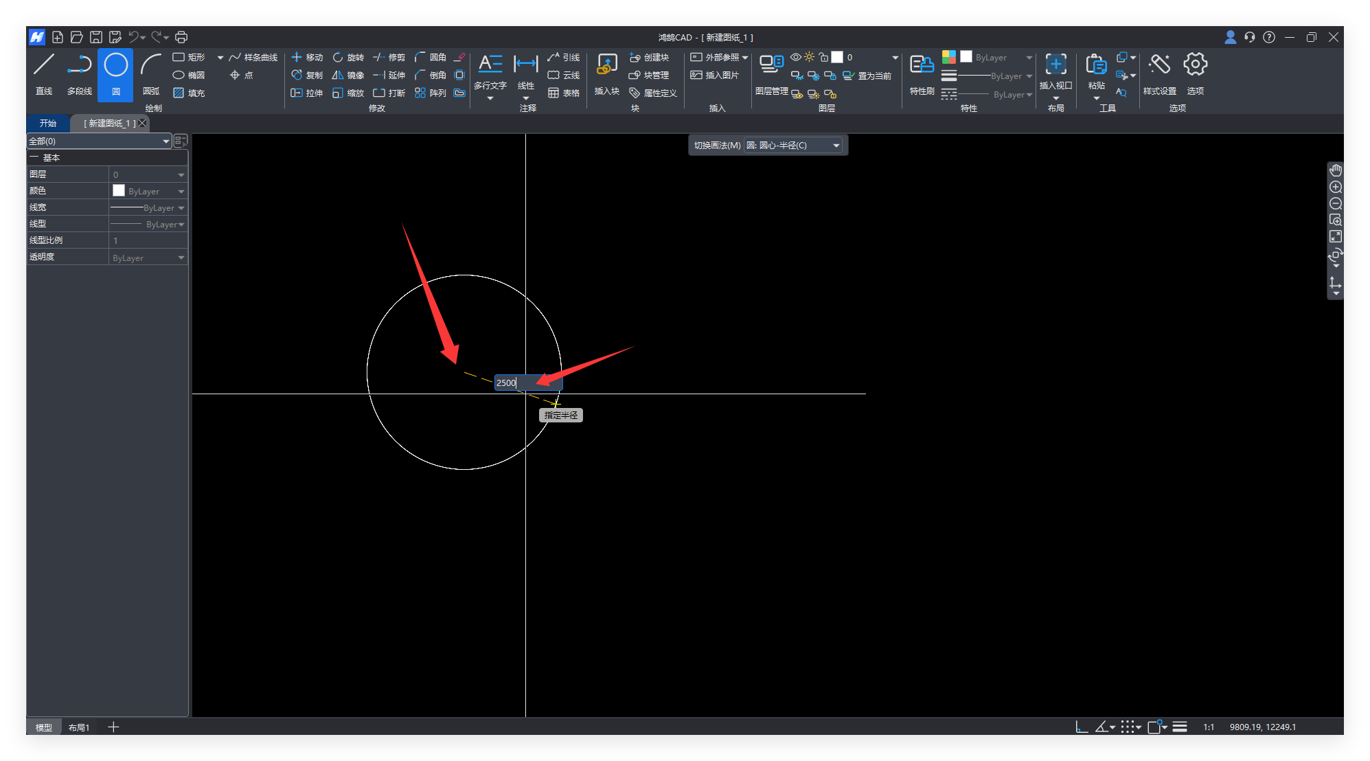 用鸿鹄CAD的绘制圆功能中选择“圆心+半径”,可以通过捕捉点位、输入坐标、直接鼠标左键选点的方式指定圆心位置,然后拖动鼠标到合适大小,或是输入指定的半径数值(这样更精准)就能立即得到一个圆。