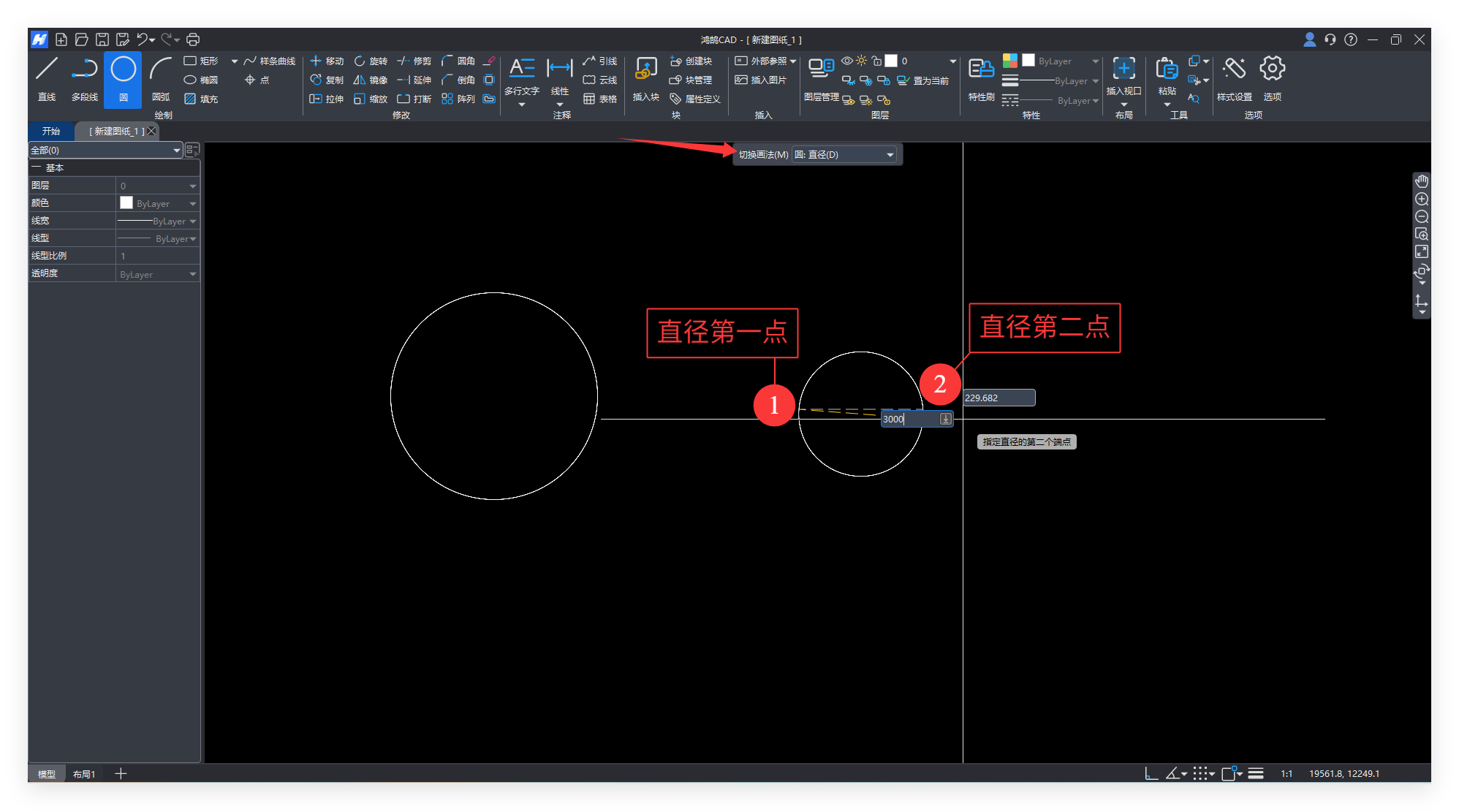 用鸿鹄CAD的绘制圆功能中选择“直径”,点选直径第一个点后,拖动鼠标就能得到一个直径等于鼠标移动距离的圆。直径第二点可以通过鼠标点选、输入直径数值、输入坐标值等方式精准确定。