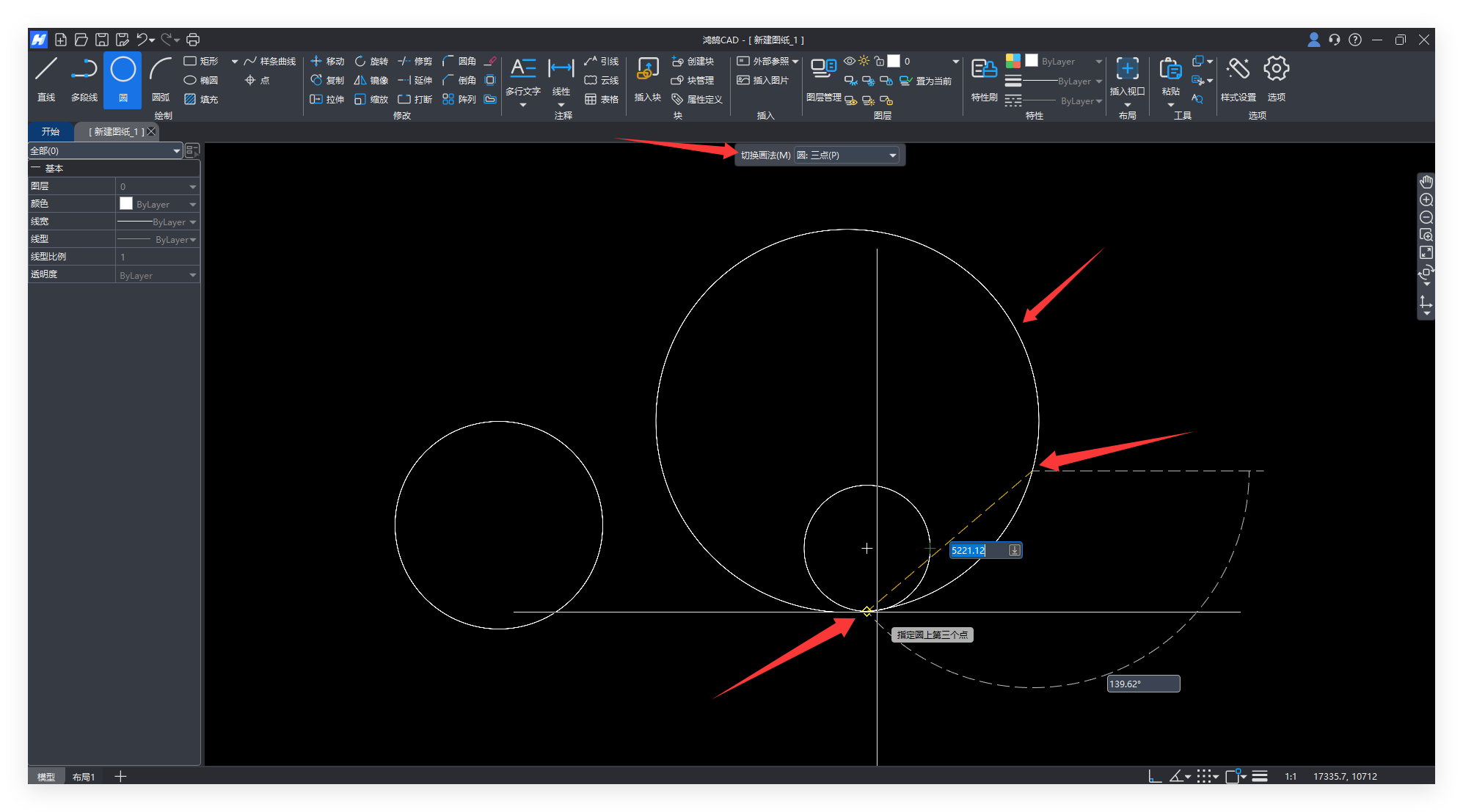 这个名字估计不少人听说过,如果我们不知道圆心、半径等数据,只知道圆上3个点的位置,用鸿鹄CAD的绘制圆功能中选择“三点”,通过点选3个点(或输入坐标值指定),就能轻松得到一个圆,不需要进行复杂计算哦。
