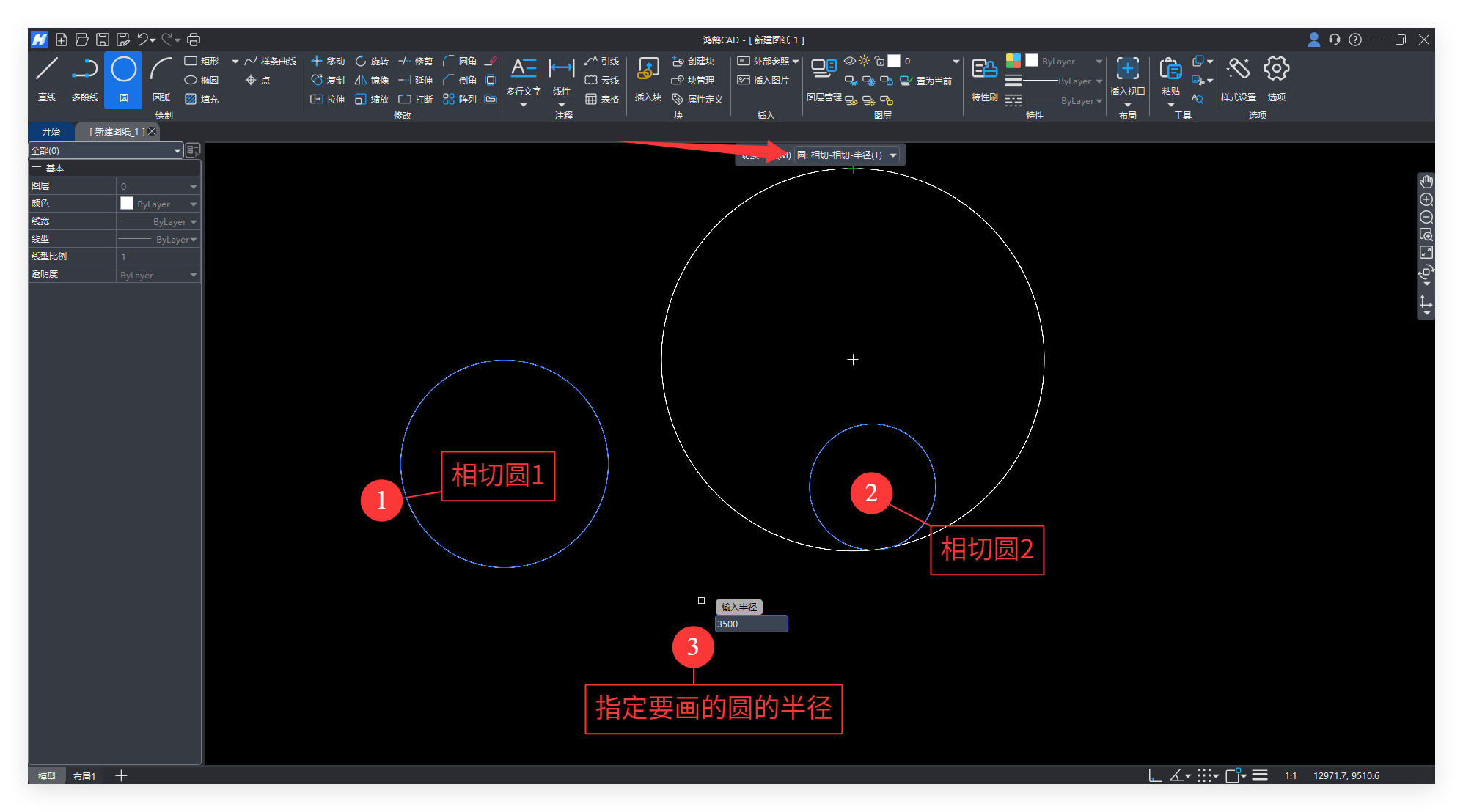 如果你的图中已有2个或以上的圆形,现在需要一个和他们相切的圆,用鸿鹄CAD的绘制圆功能中选择“相切-相切-半径”,无需计算圆心,直接选中已知的两个圆,再输入半径数值(以3500为例),就能快速得到一个非常标准的,和前两个圆相切的圆形。