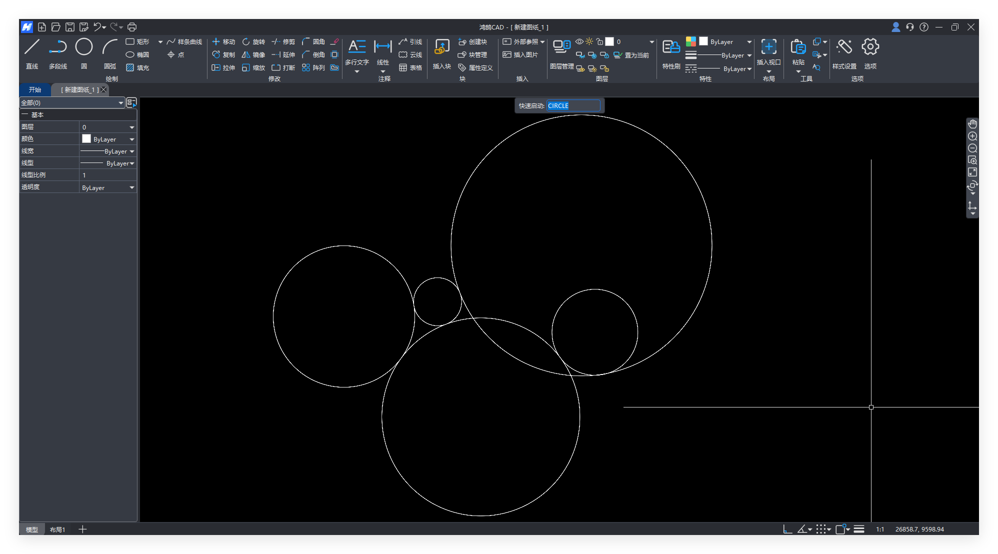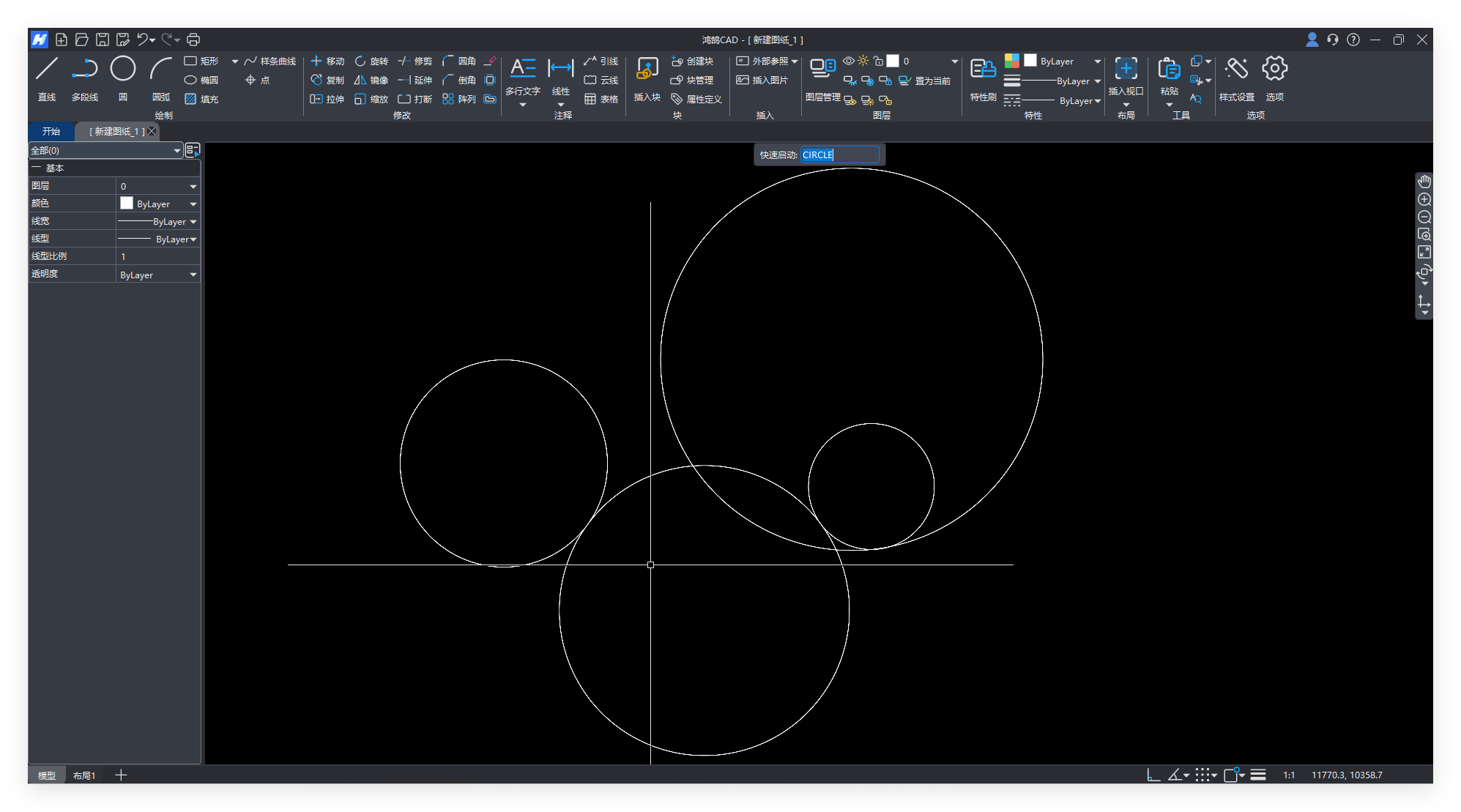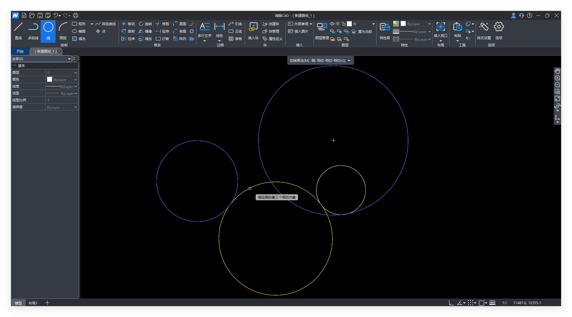 当你有了3个及以上圆形,想要绘制一个和其中3个圆相切的圆,怎么办?别怕,用这个方法,既不需要计算圆心,也不需要计算半径。你只需要在鸿鹄CAD的绘制圆功能中选择“相切-相切-相切”,然后分别选中3个圆,软件就会在选中第三个圆的第一时间立马画好你想要的圆形。