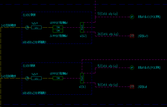 1、交换机图纸设计一般设计在干线系统图中,平面图呈现相对较少,如下图所示