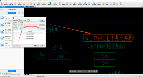 4、按键盘上CTRL+F快捷键,触发文字查找弹窗,输入查找内容,勾选本软件添加的文字和测量标注,点击查找,即可统计出48口POE千兆交换机的工程量