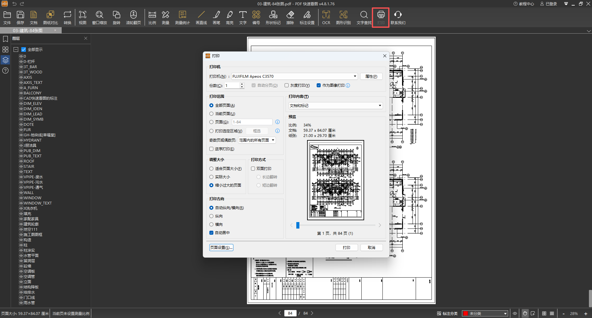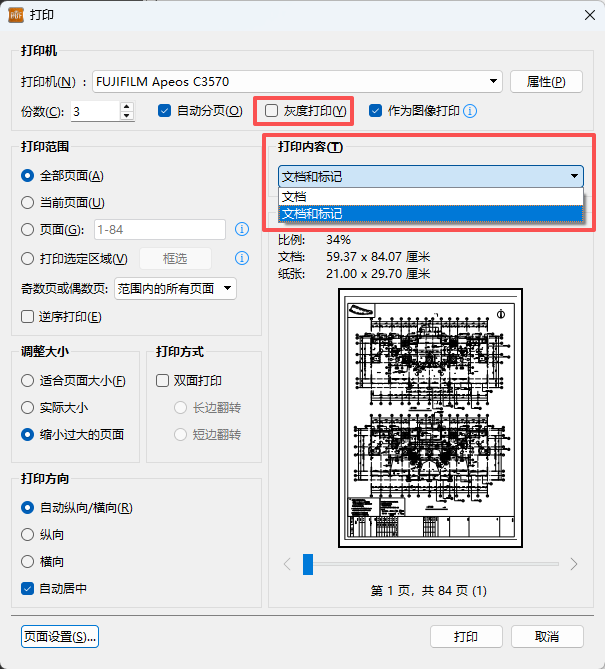 可选择“文档和标记”(同时打印图纸及上面的批注)或“文档”(仅打印纯净图纸)。