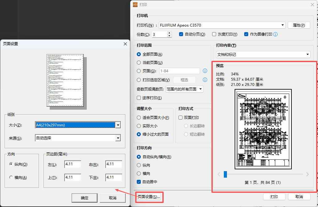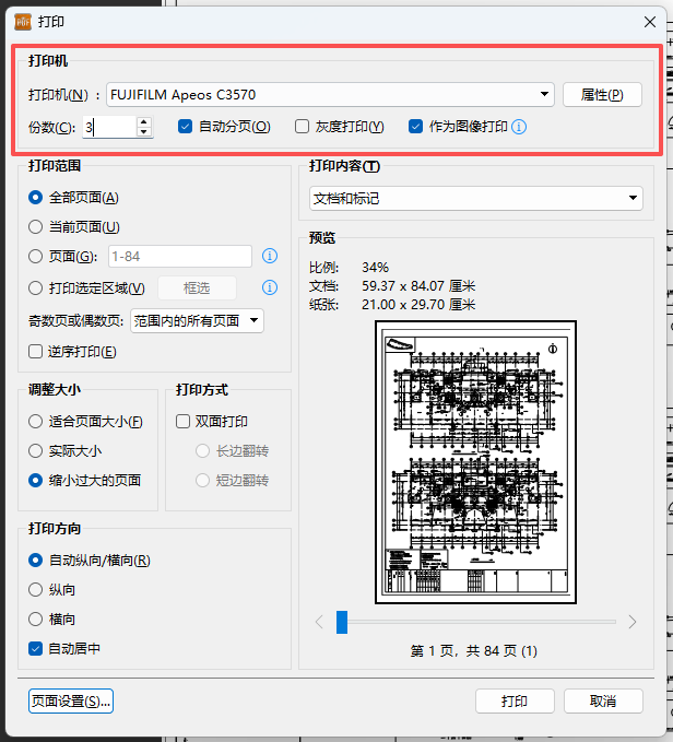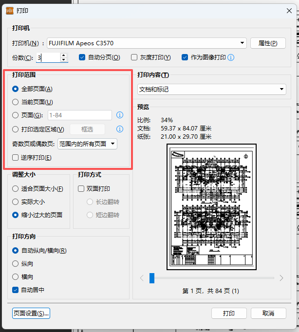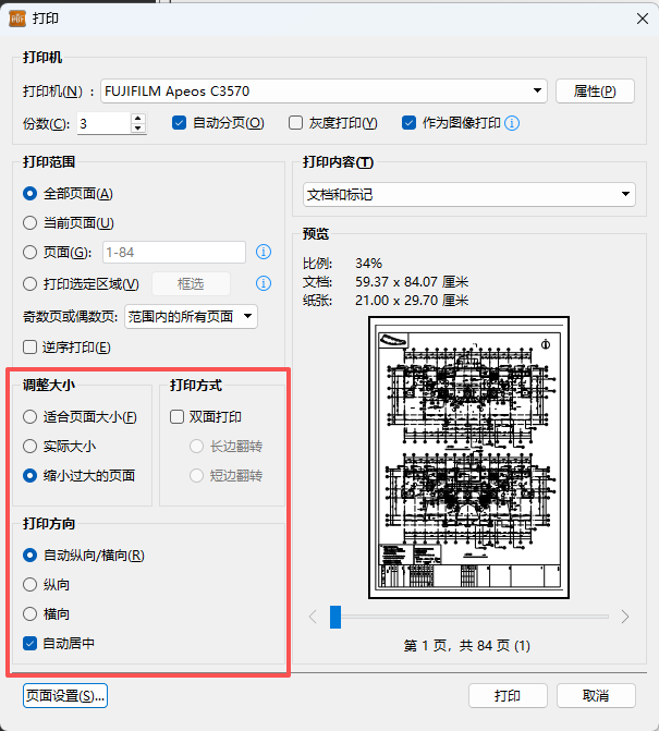 调整大小:推荐选择“适合页面大小”,让图纸智能适配纸张,避免内容溢出。