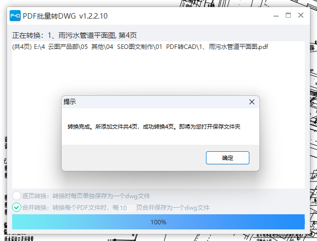 可以选择:逐页转换,转换时每页单独保存为一个dwg文件;合并转换,转换每个PDF文件时,按每多少页合并保存为一个dwg文件等方式。