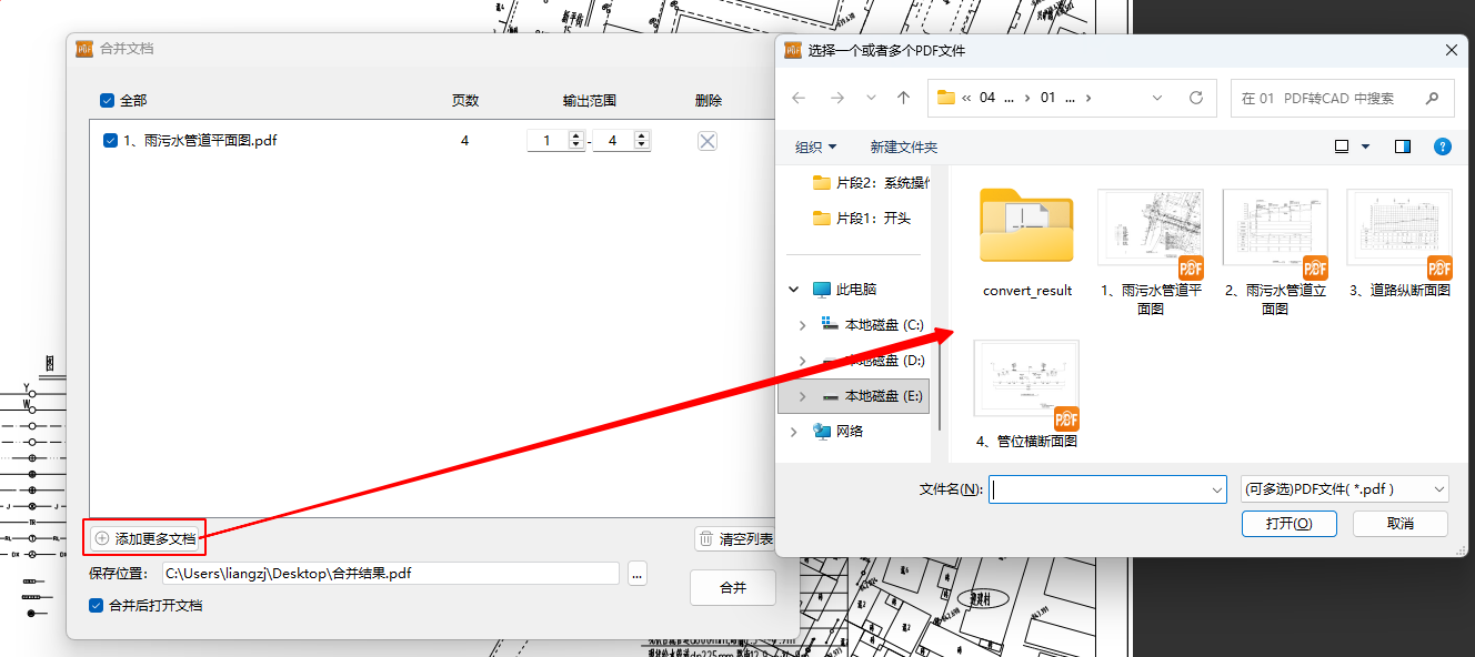 1、在弹出的合并窗口中,点击“+”按钮,批量选择您需要合并的PDF图纸(至少2个以上)。