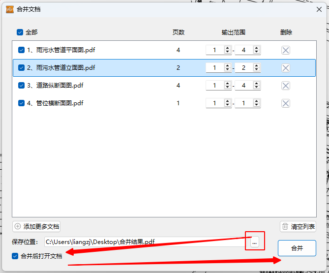 3、 确认无误后,点击右下角的【合并】按钮,即可瞬间生成一份整合完毕的PDF图纸。