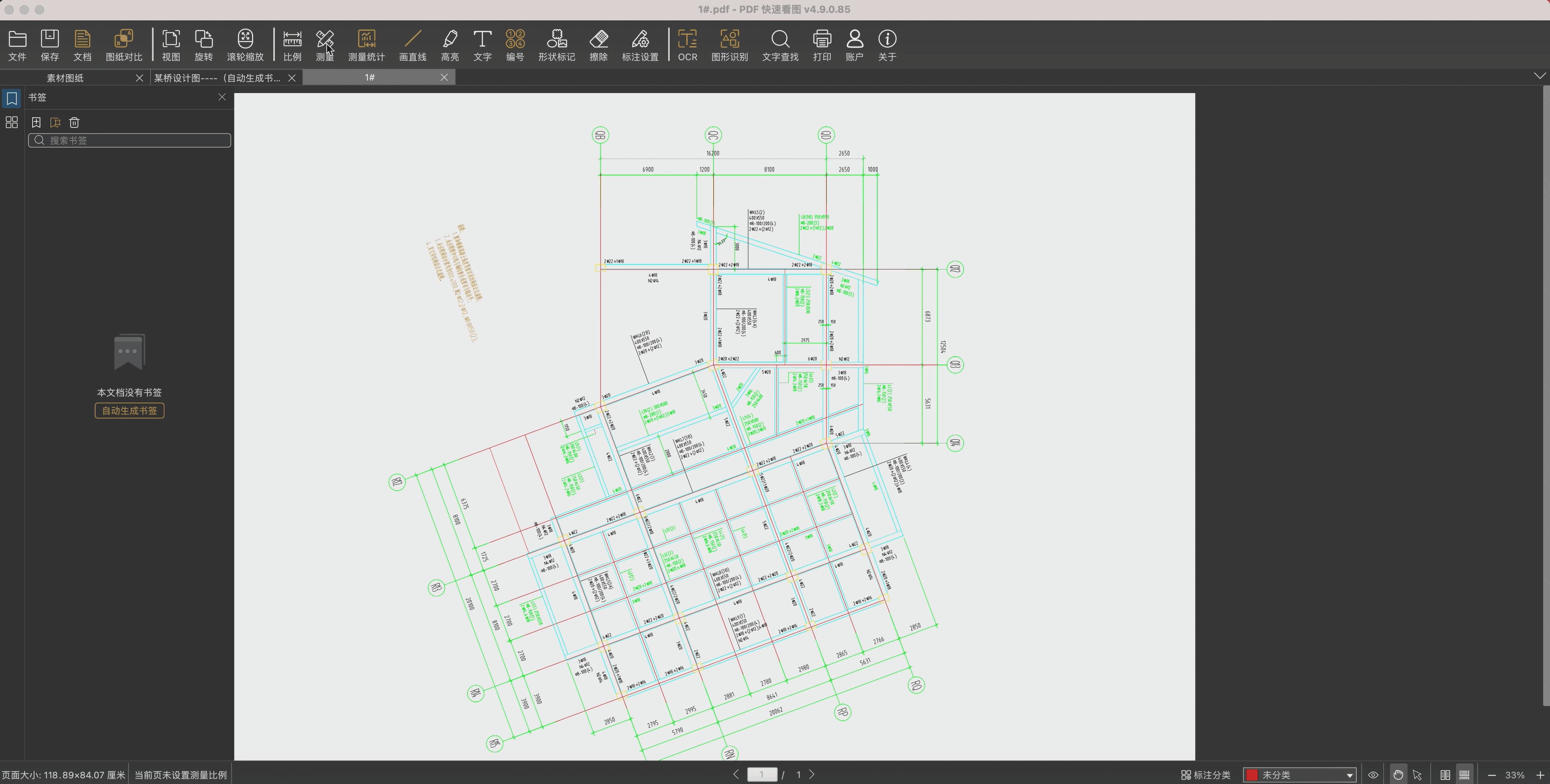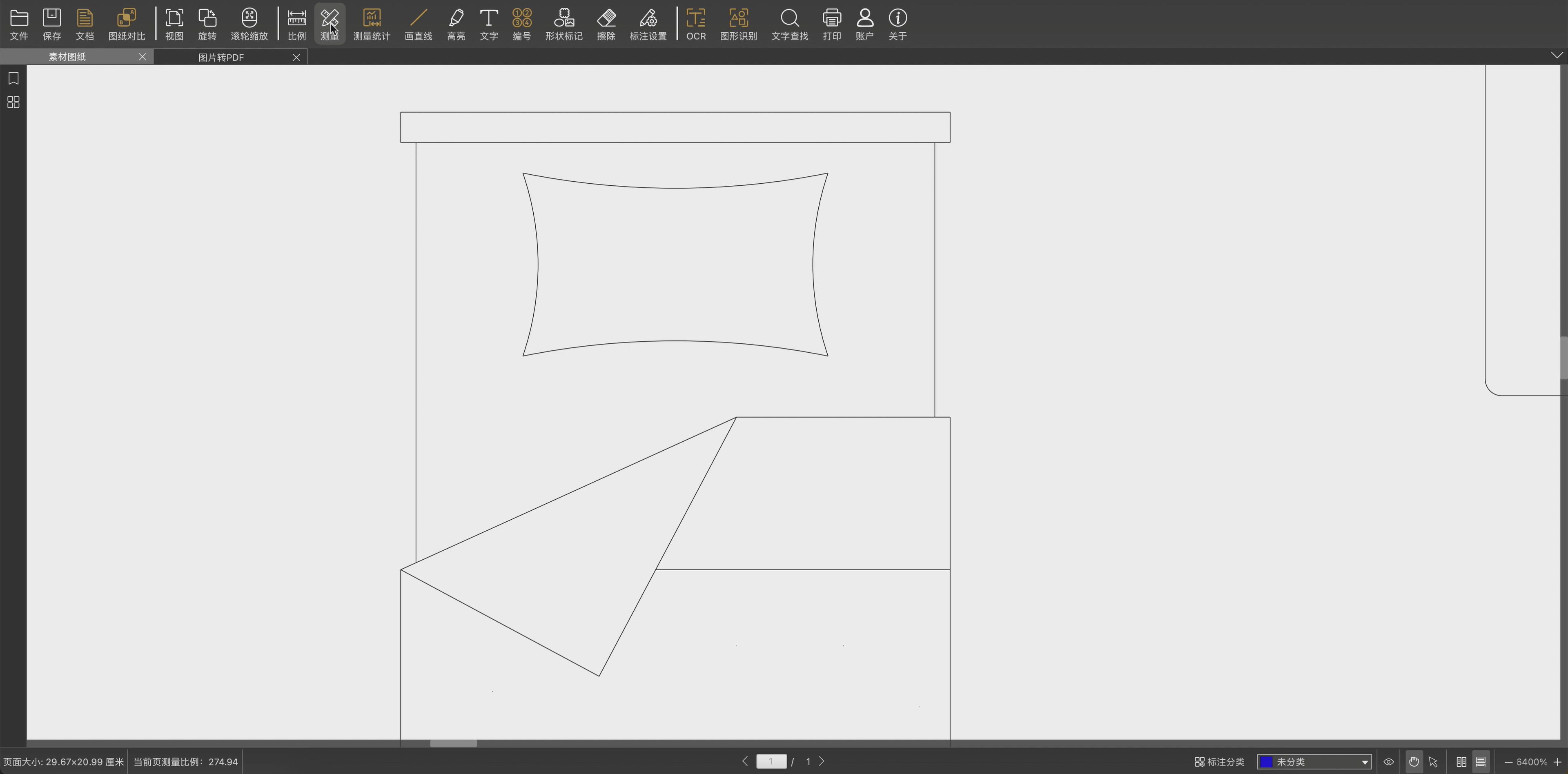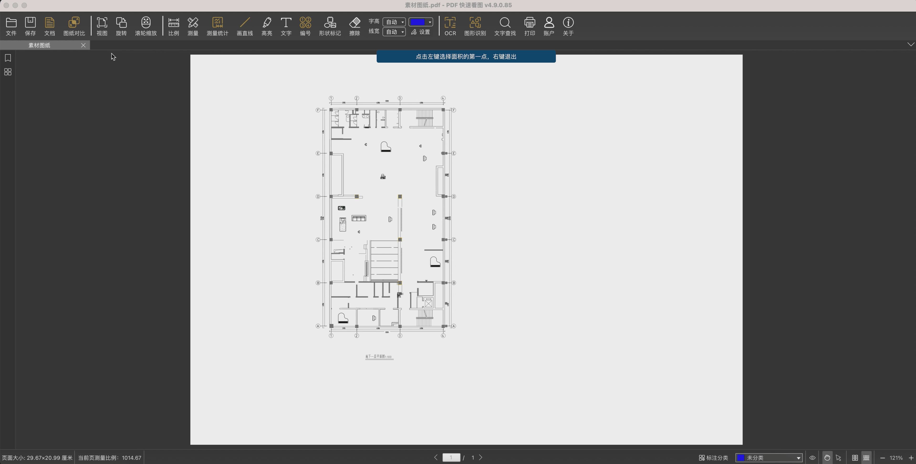 1. 首先打开一张PDF格式的图纸,点击 【测量】,在【测量面板】上选择测量功能。测量功能包含以下几个模块: