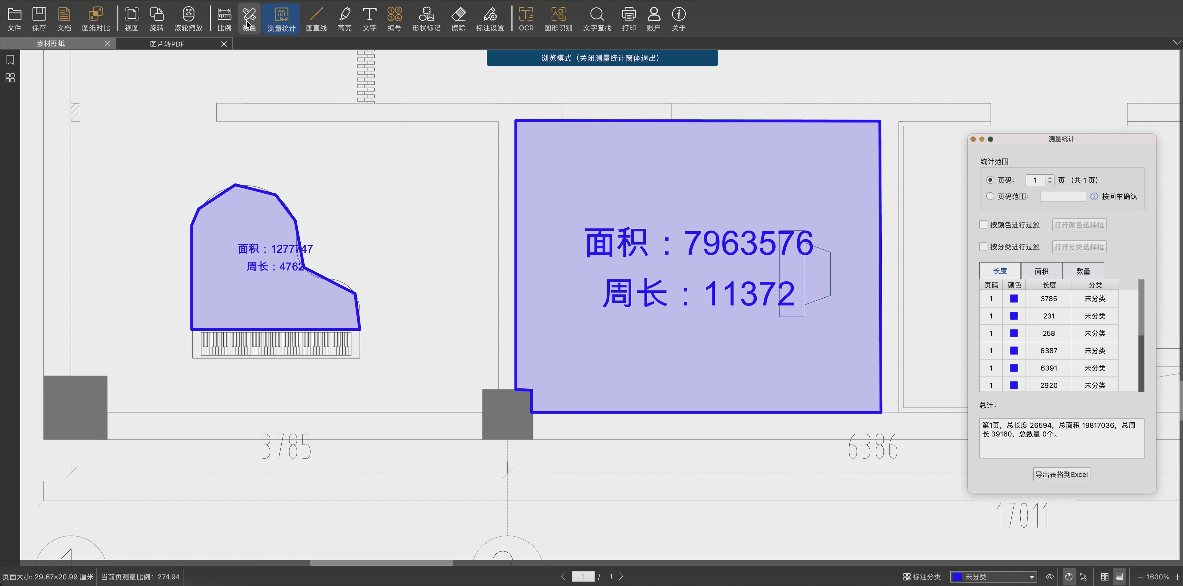 7.1. 测量统计:点击测量统计,即可轻松统计快看标注的长度,面积等。具体操作课参考教程:https://club.everdrawing.com/question/detail/13332(mac与Windows操作基本一致)