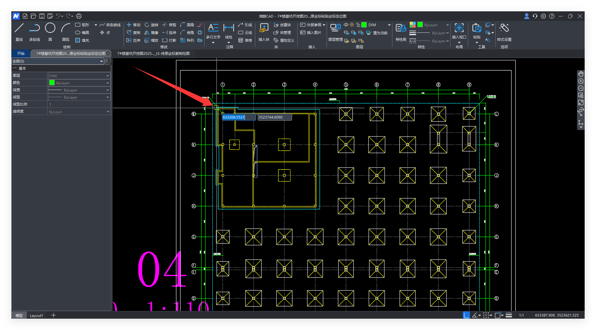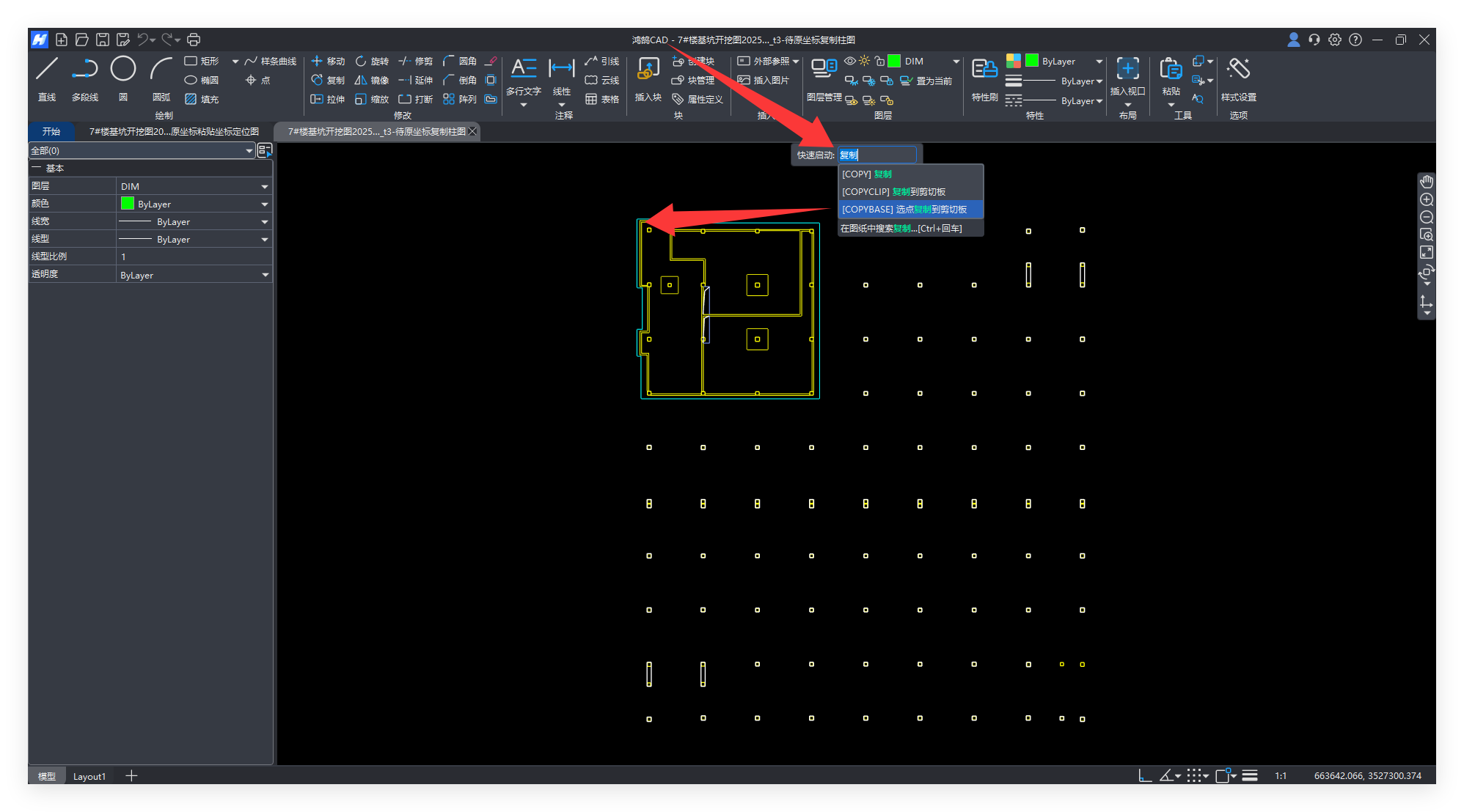 合并“基坑开挖图纸”,以左上角的点位(在基坑图中有对应的线条,这样方便定位)作为复制粘贴的基点,从柱图复制
