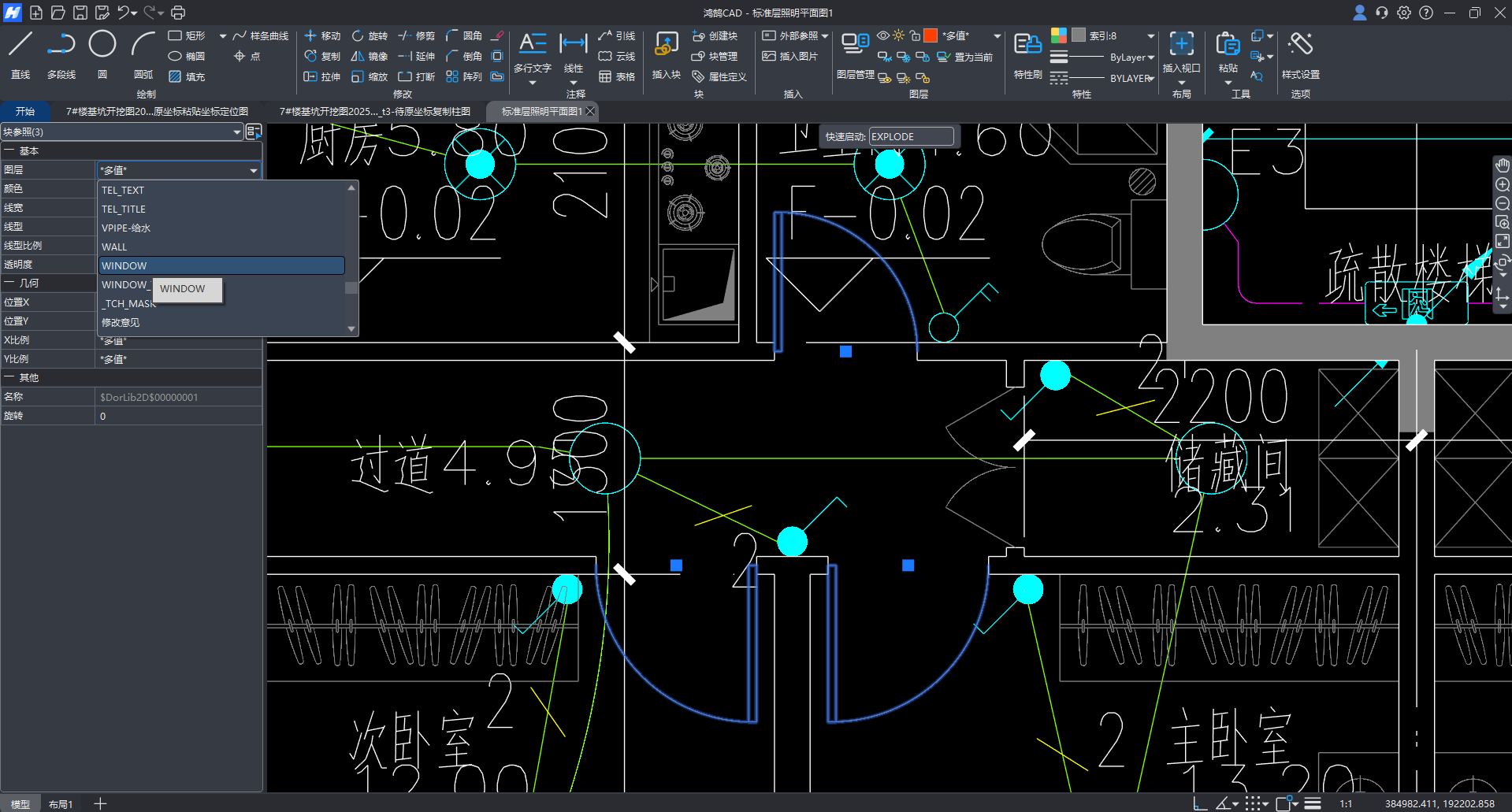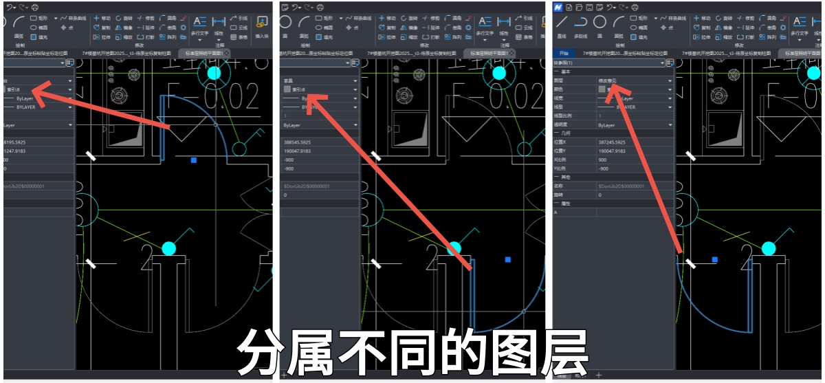 如下图,同样的门画在了不同的图层,我们可以选中这些门,在鸿鹄CAD左边的属性栏选择图层,就统一调整好了门的归属图层,方便更加精准地识别图纸工程量。