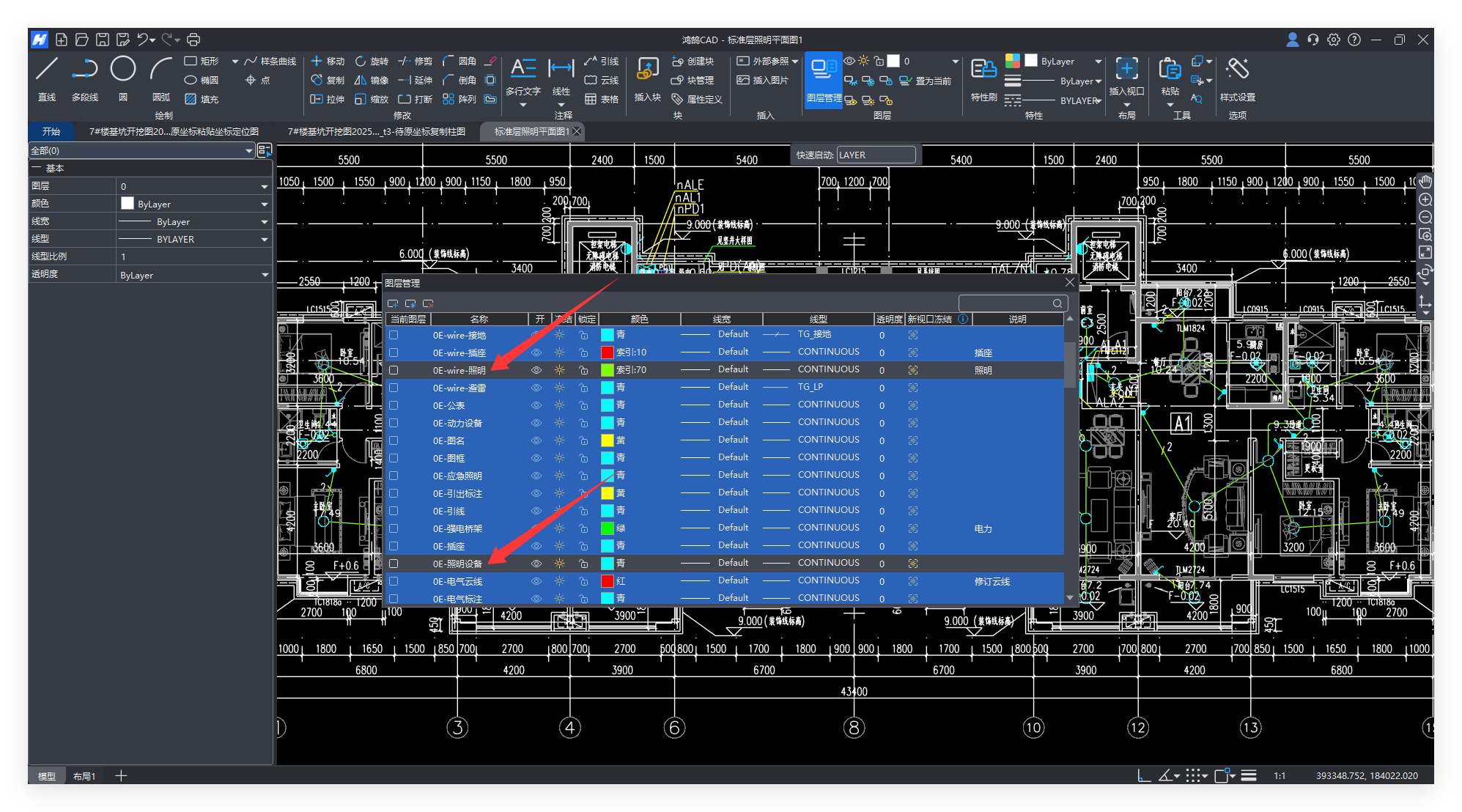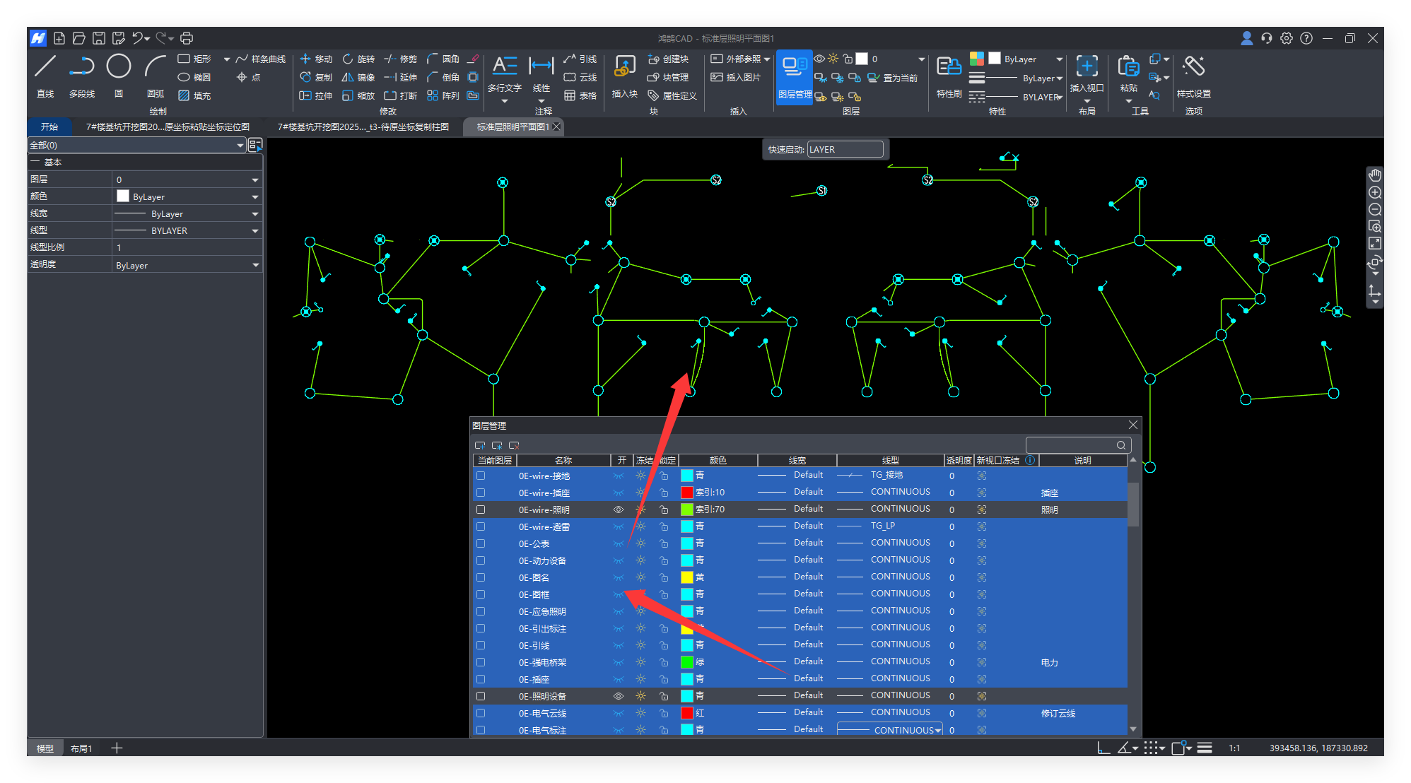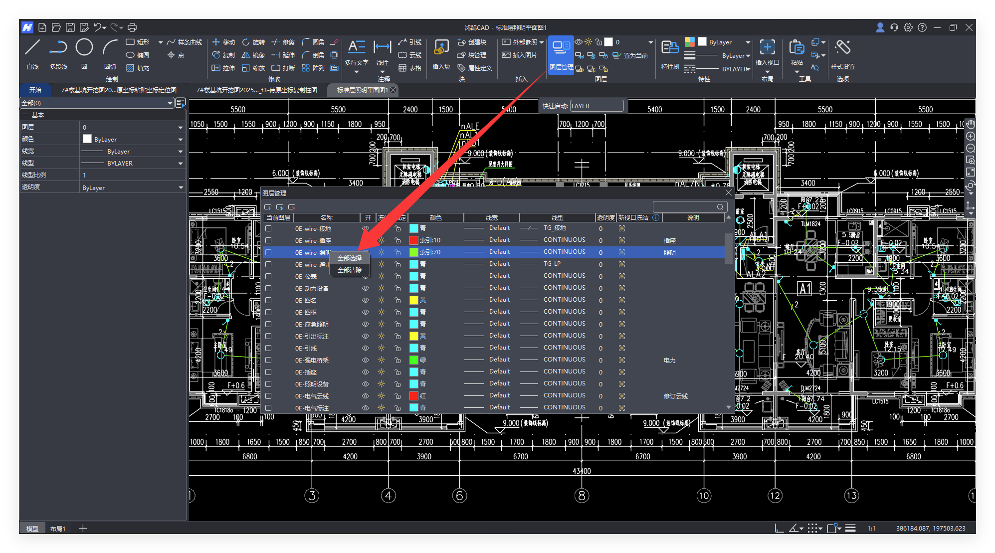 如下图,内容繁多,想只查看电线和开关的内容,可以在鸿鹄CAD中点击【图层管理】,选中任意图层后右键【全部选择】。